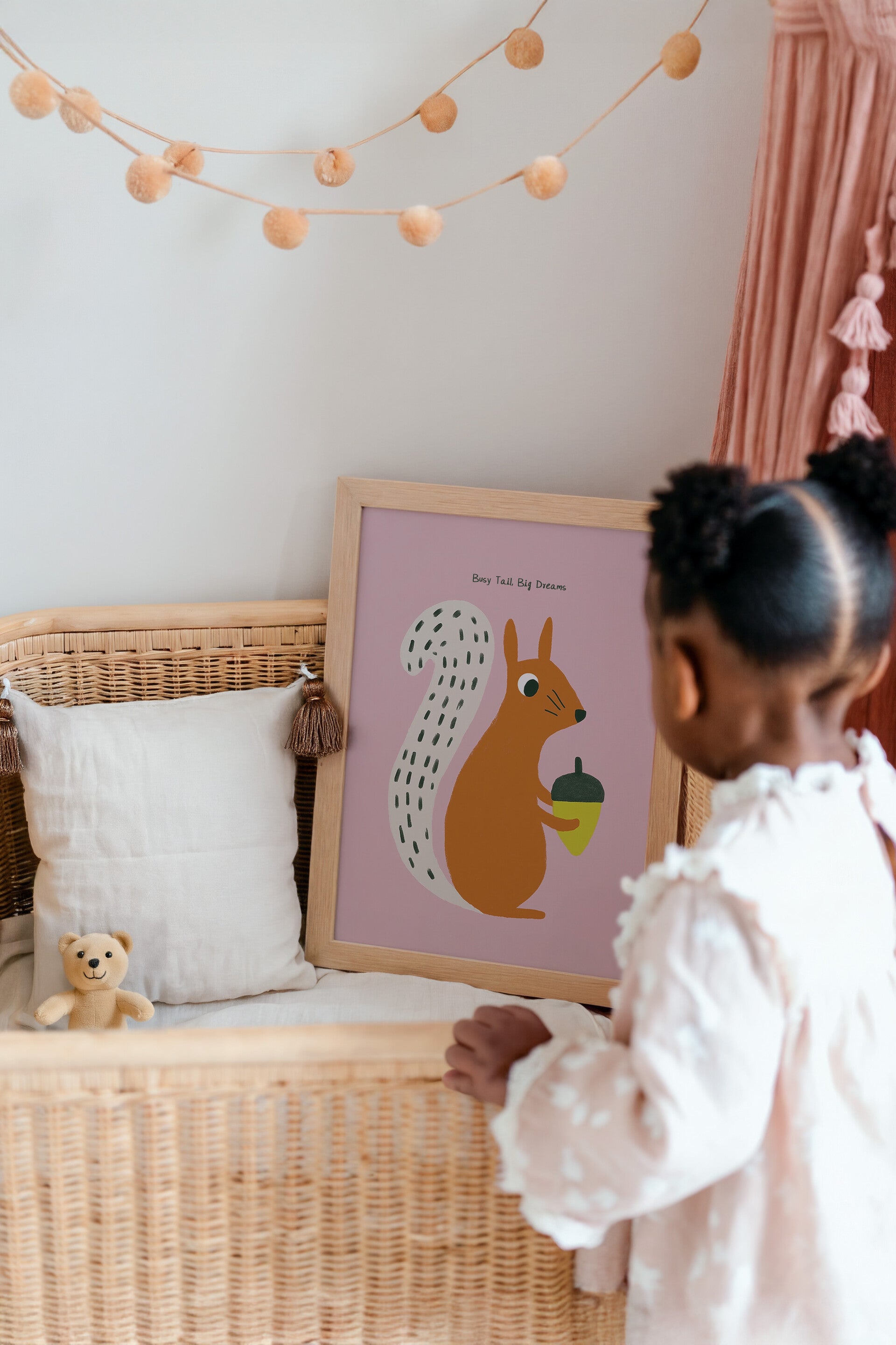 Geef de kinderkamer een trendy en speelse touch deze leuke poster van een eekhoorntje met tekst: busy tail, big dreams.