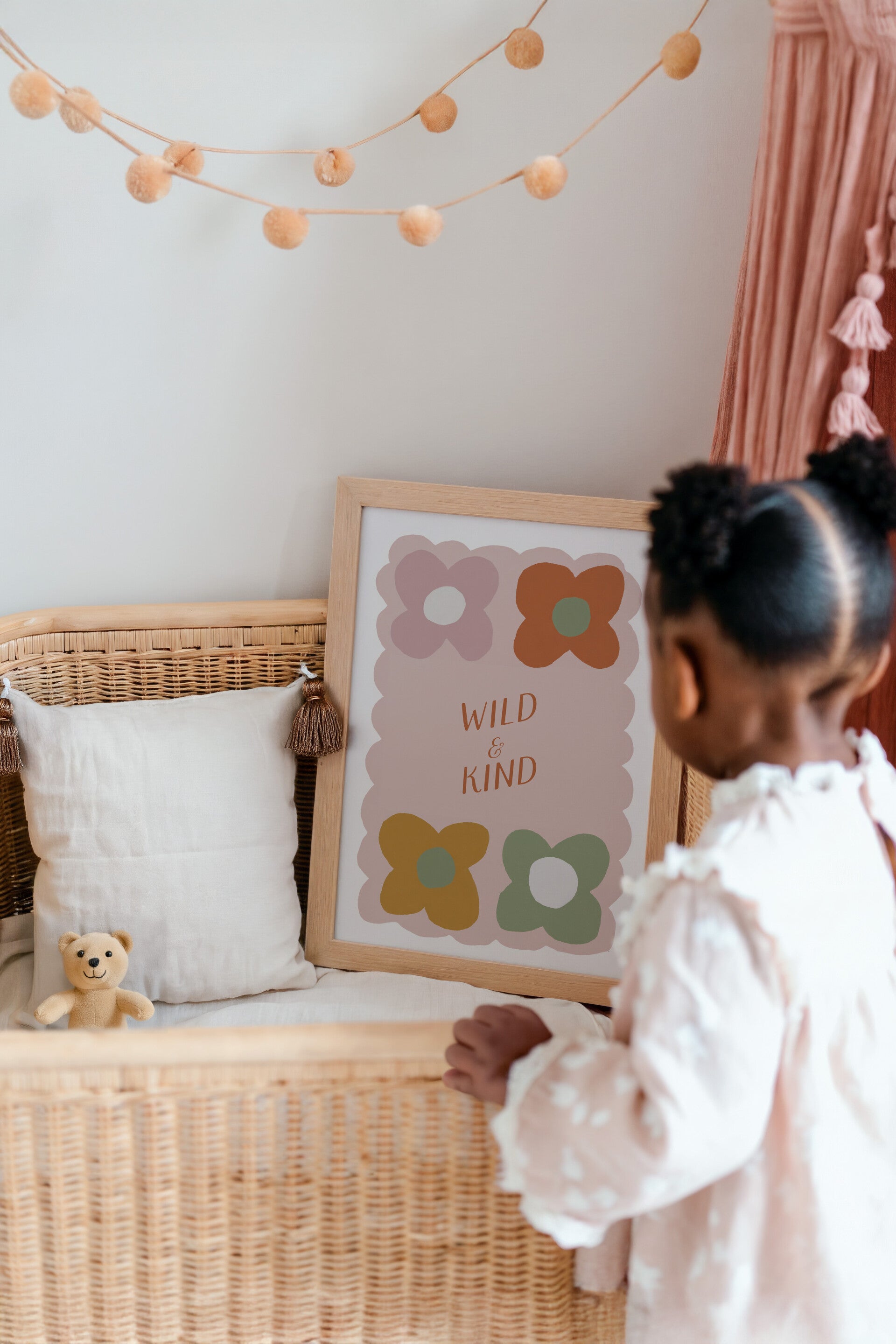 Geef de kinderkamer een trendy en speelse touch met deze kleurrijke print van madeliefjes en tekst: Wild & kind.