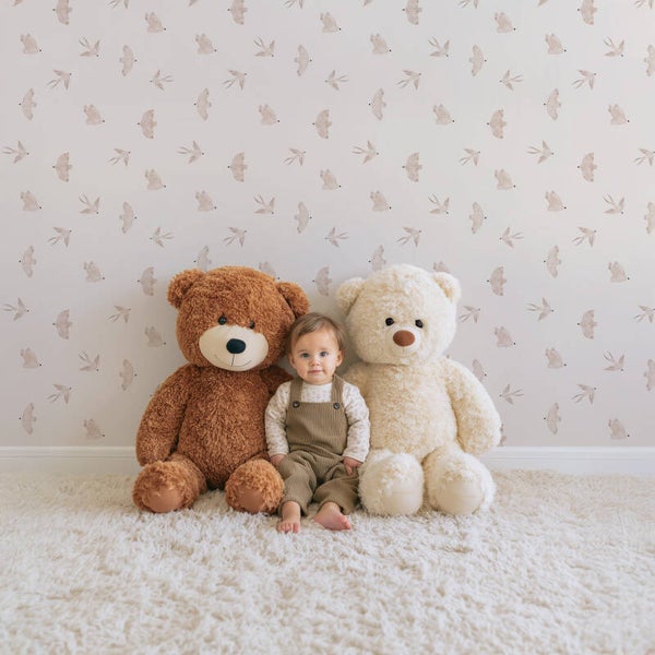 Dit superleuke patroonbehang voor de baby- en kinderkamer heeft een fijne beige ondergrond met schattige zwaluwen in een donkerder beige tint.