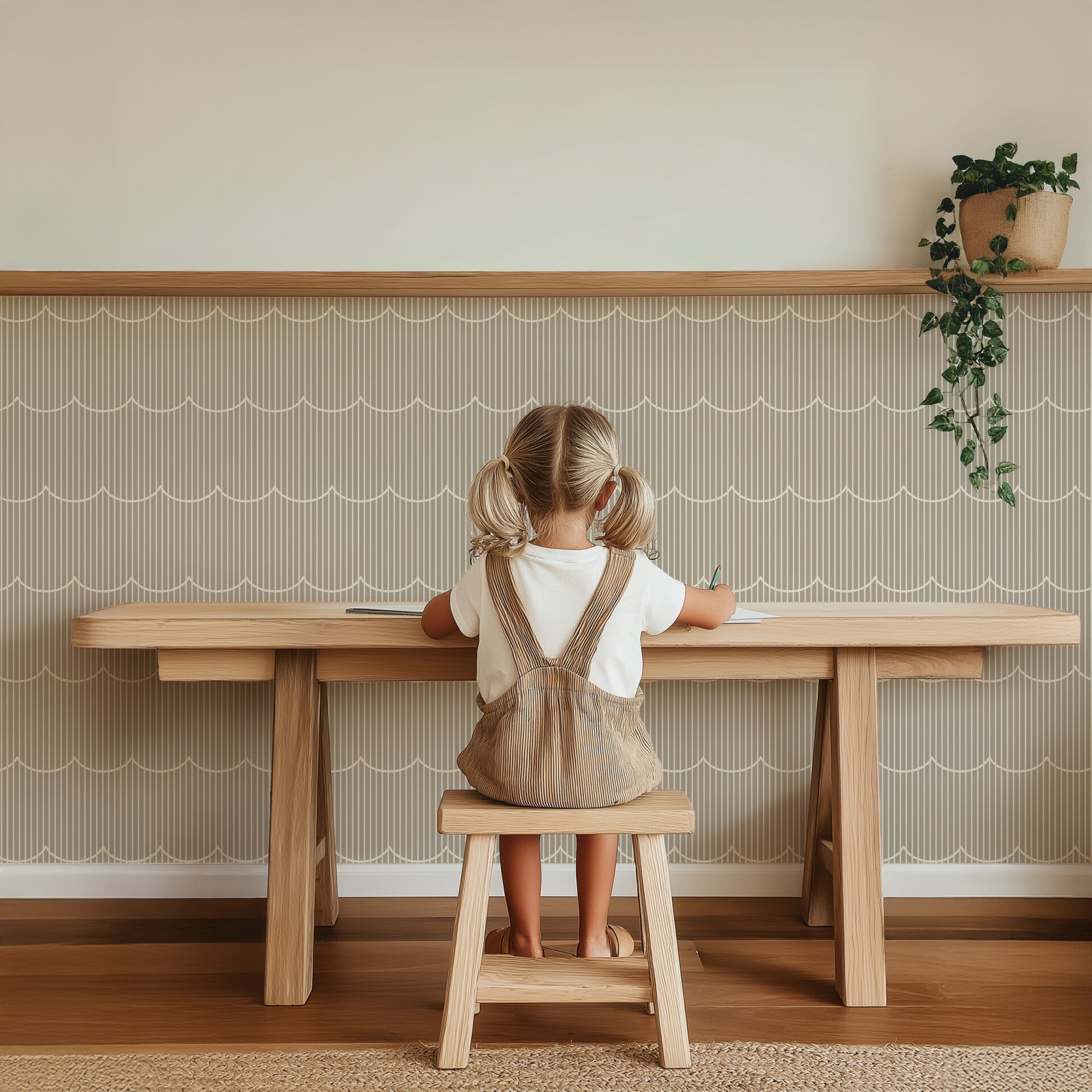 Zacht, subtiel en stijlvol: Retro Waves in zandbeige brengt een kalme basis in de kinderkamer. Het verfijnde golvenpatroon in combinatie met verticale lijntjes zorgt voor een moderne retro uitstraling.