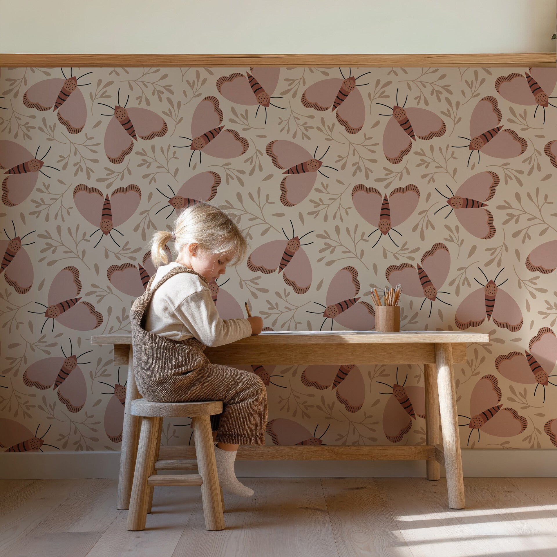 Geef de kinderkamer een vleugje karakter met het unieke ‘Moth Terra’ behang. Dit charmante ontwerp met gestileerde motjes in warme terra- en rozetinten is een echte eyecatcher.