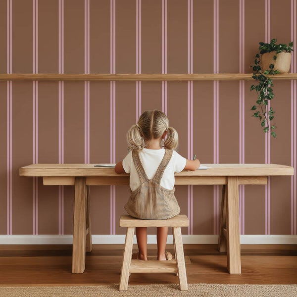 Speels en toch stijlvol: Twisty Twins – Chocolat brengt warmte en karakter in de kinderkamer. De dubbele strepen in zachtroze tinten contrasteren prachtig met de diepe chocoladekleur en zorgen voor een ritmisch, vrolijk patroon dat zowel tijdloos als kindvriendelijk is. Een ideale keuze voor wie een gezellige basis wil, met nét dat beetje speelse twist.
