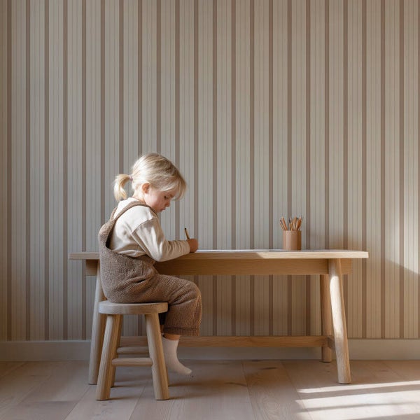 Sweet Stripes – Nougat brengt warmte en rust in de kinderkamer. De strepen in zachte bruintinten zorgen voor een tijdloze, natuurlijke basis die makkelijk te combineren is met andere kleuren en materialen. Perfect voor een knusse kamer waarin gespeeld en gedroomd kan worden.