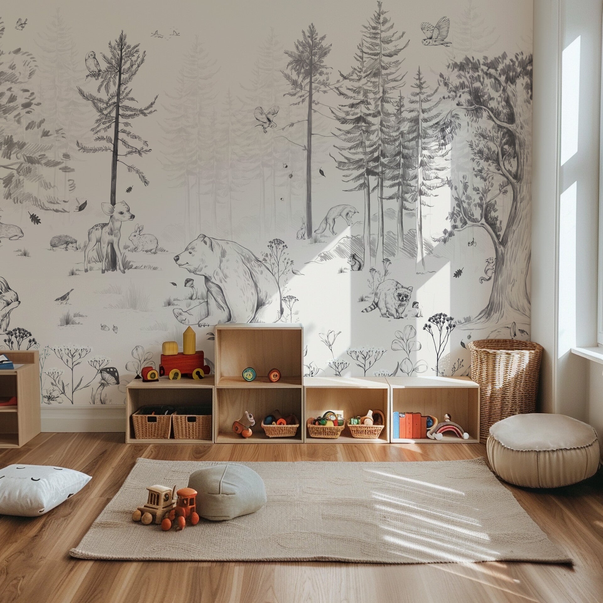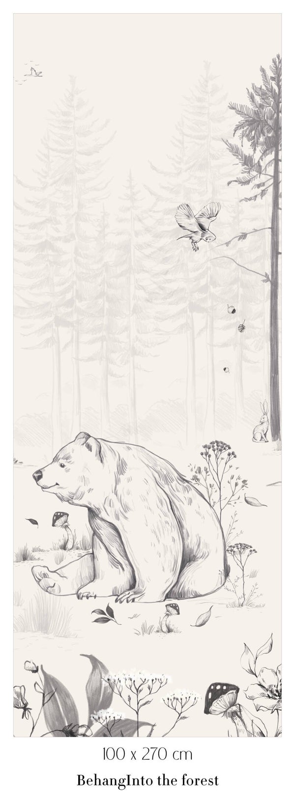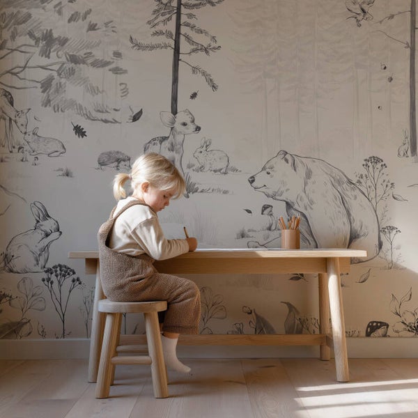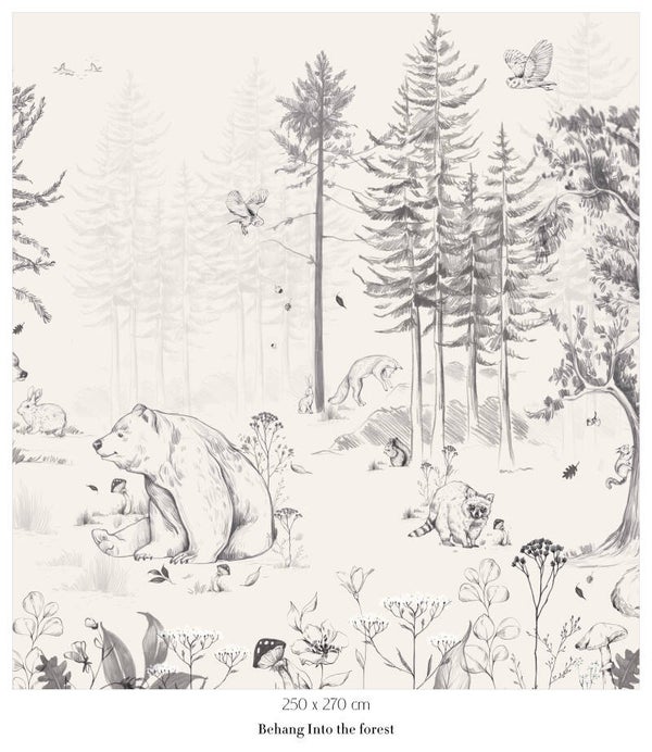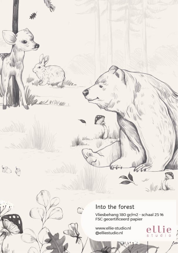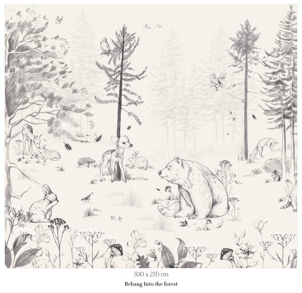Welkom in het stille, betoverende bos van Into the Forest — een plek waar herten nieuwsgierig gluren tussen de bomen, beren rustig picknicken tussen de paddenstoelen, en uiltjes zachtjes over je heen waken. Dit prachtige behang brengt een gevoel van rust en verwondering in de kinderkamer, alsof je even stilstaat in het hart van de natuur.