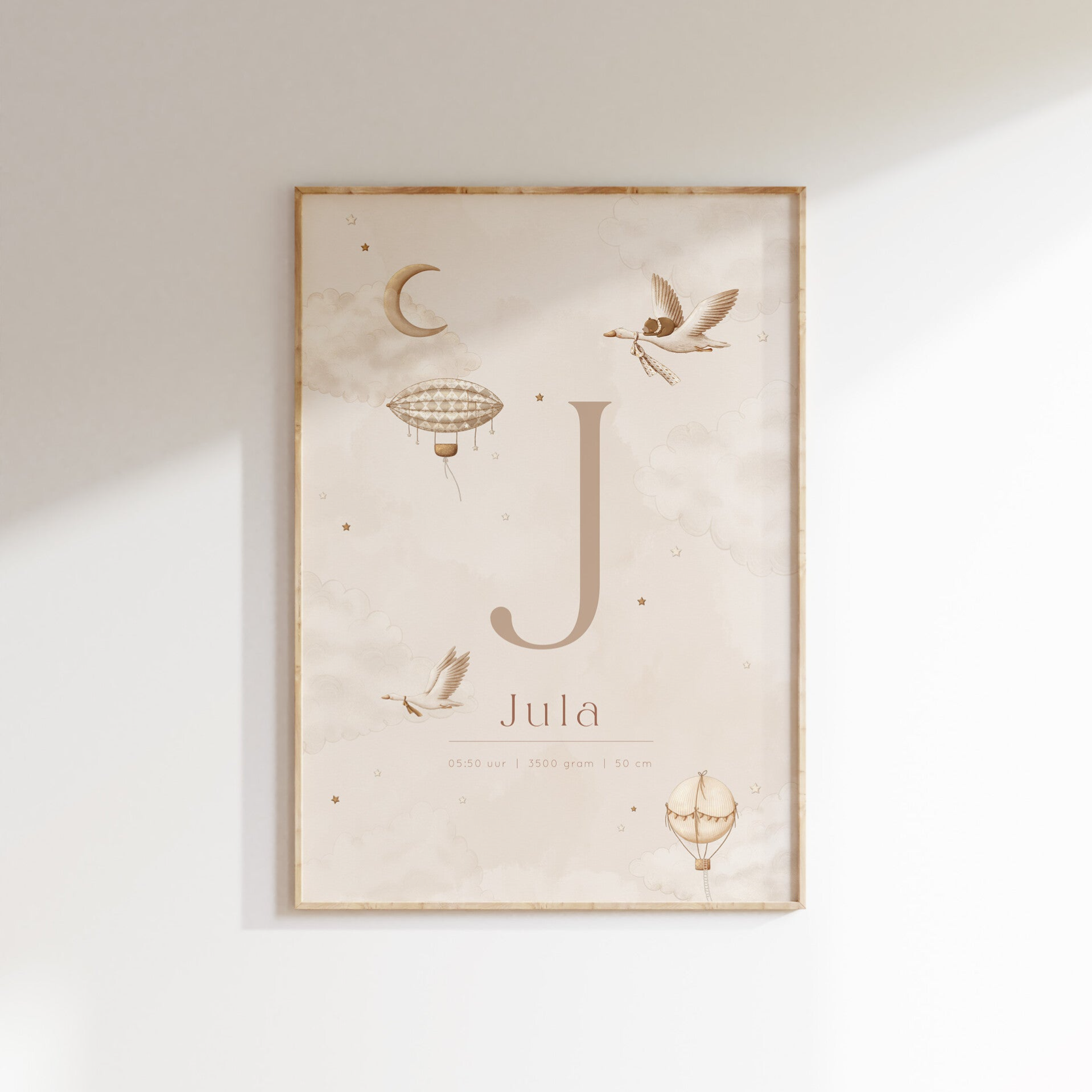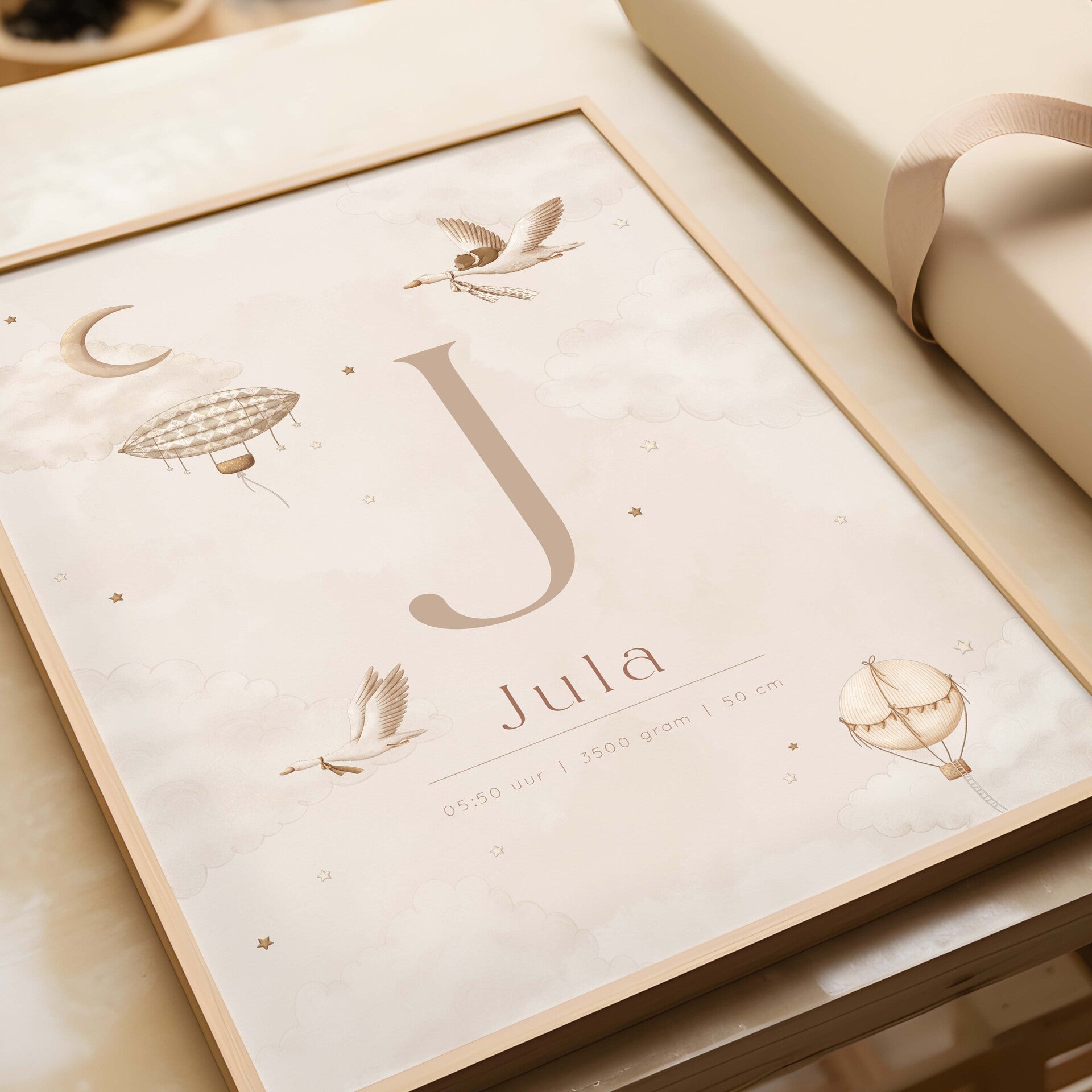 De warme beige tinten en subtiele illustraties maken het een tijdloos kunstwerkje dat moeiteloos past in elke babykamer. Perfect als persoonlijk kraamcadeau of blijvende herinnering aan het mooiste begin.