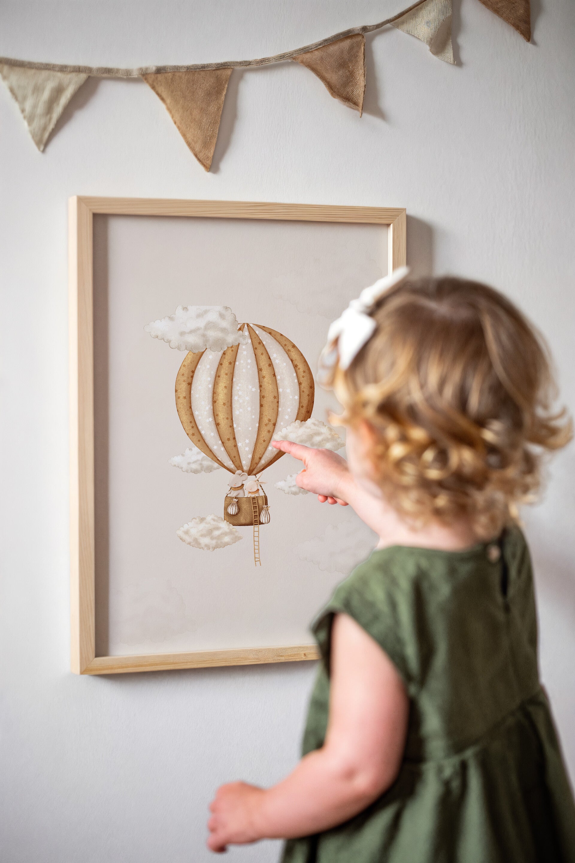 Een klein konijntje zweeft hoog boven de wereld, veilig in zijn luchtballon tussen zachte wolken en gouden sterren. De Konijntje in de Wolken poster ademt rust, verwondering en geborgenheid – perfect voor de kinderkamer van kleine dromers.