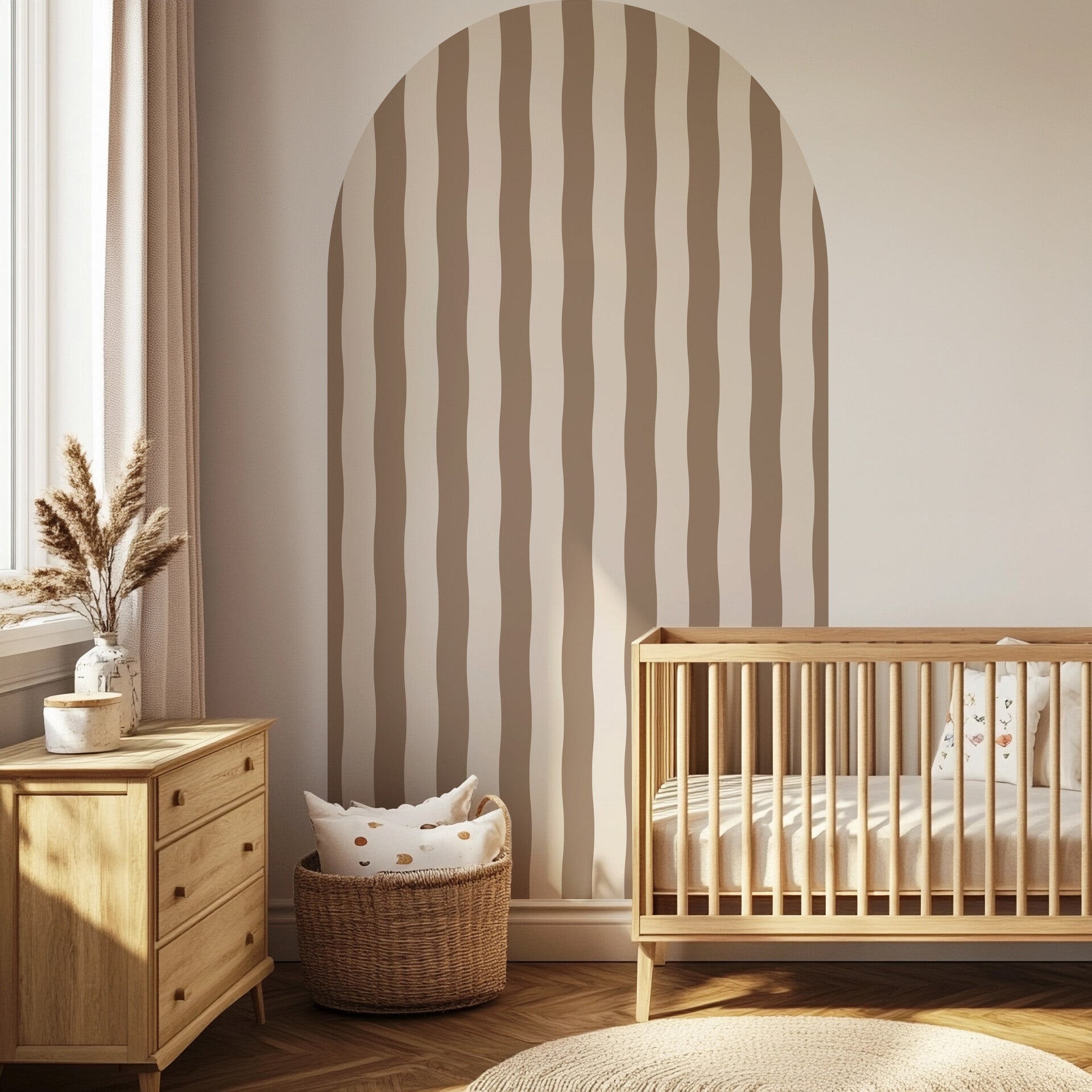 Geef de kinderkamer een speelse en stijlvolle touch met deze zelfklevende behangboog met mocca strepen in een lichte wave.