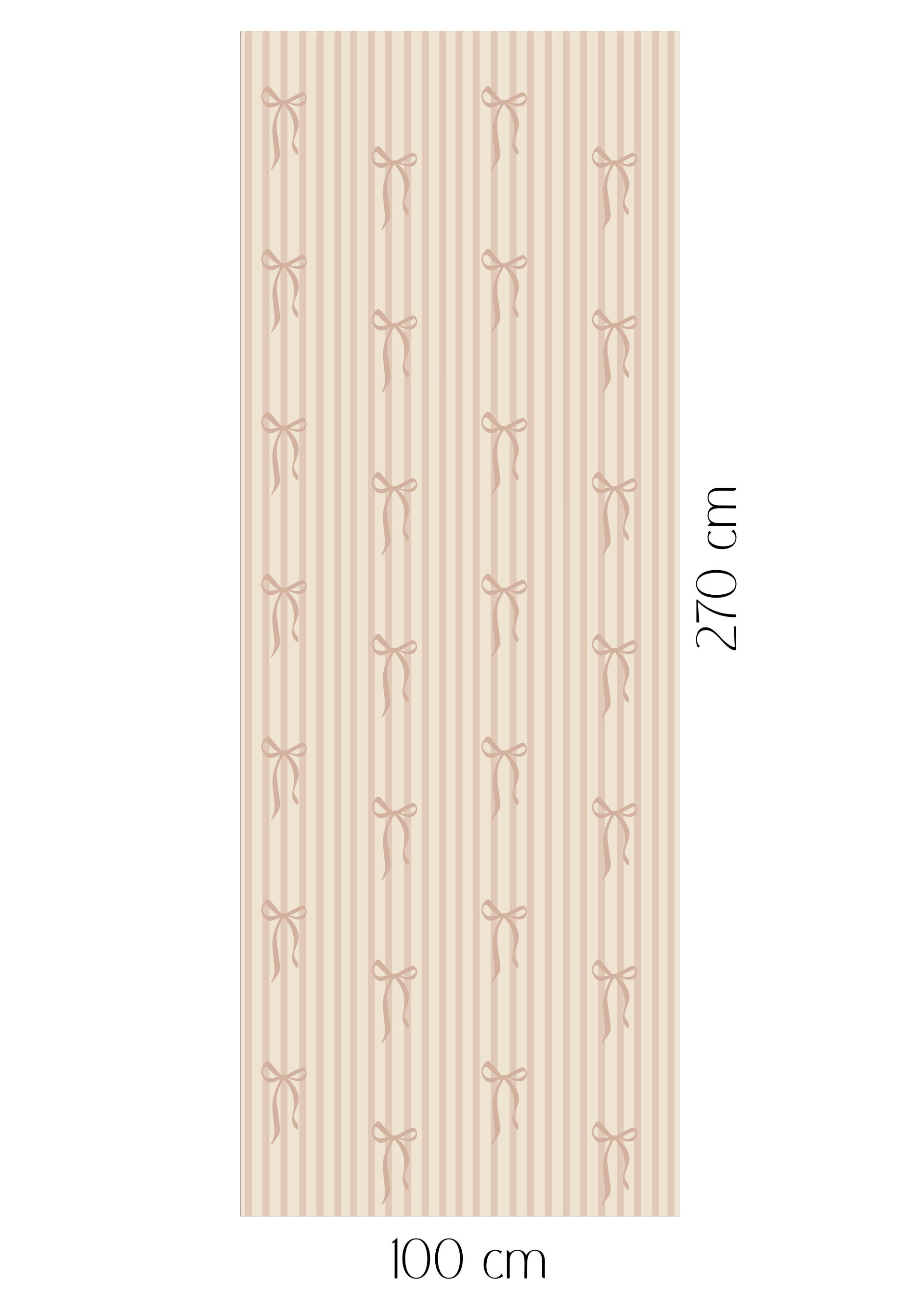 Ons behang met liefelijke strikjes en zachte, verticale strepen brengt een warme, elegante sfeer in de kinderkamer. De subtiele strikmotiefjes geven de ruimte een speels accent, zonder onrustig te worden. Ze voelen als kleine, fijne details die de kamer samenbinden alsof ieder strikje een moment van vrolijkheid toevoegt.
