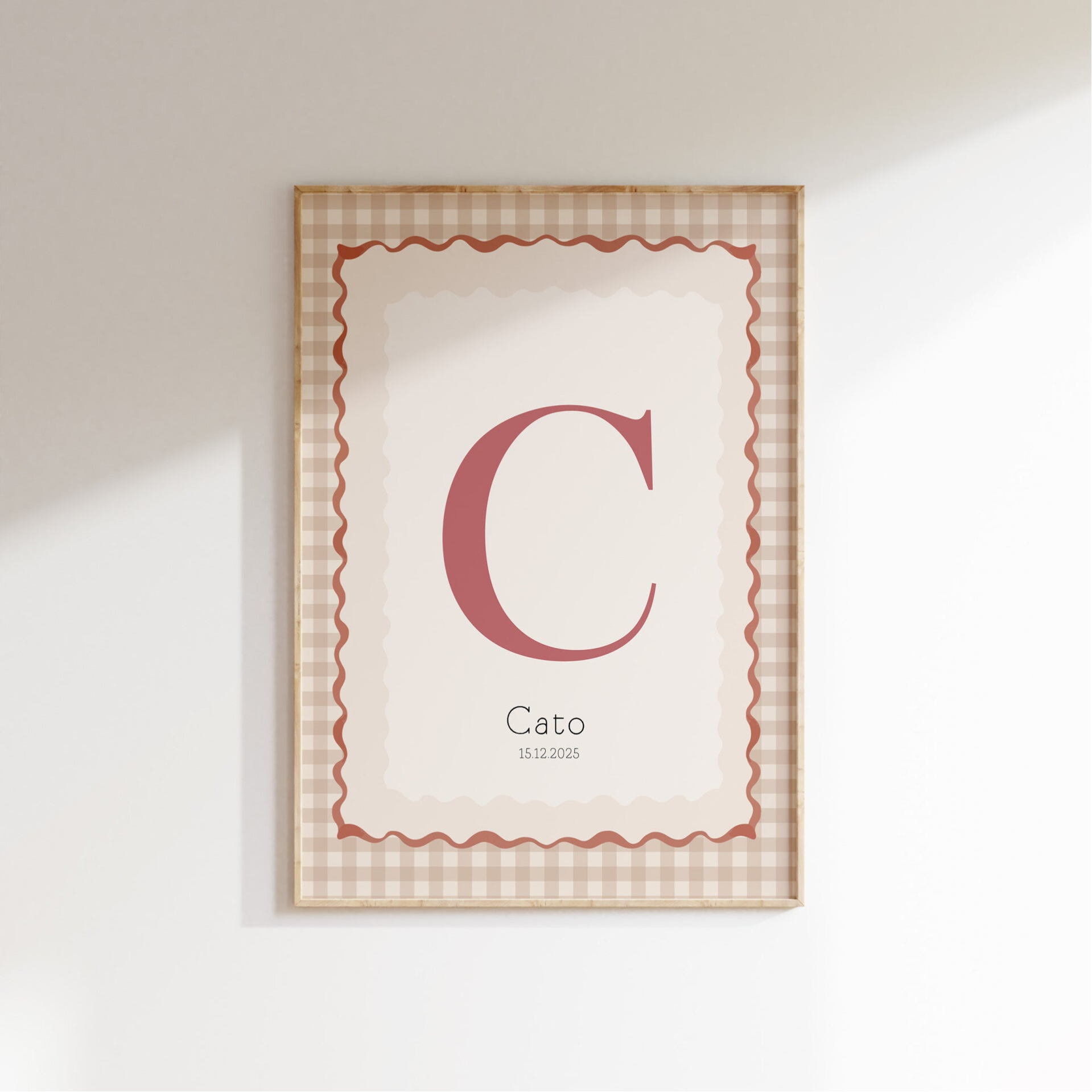 Een elegante en persoonlijke geboorteposter met de initiaal C in een warme, zachte tint. Het gingham-patroon op de achtergrond en de speels golvende randen geven het ontwerp een lieve, tijdloze uitstraling. Onderaan staan de naam Cato en de geboortedatum subtiel vermeld—een prachtig en stijlvol aandenken voor de babykamer of als uniek kraamcadeau.
