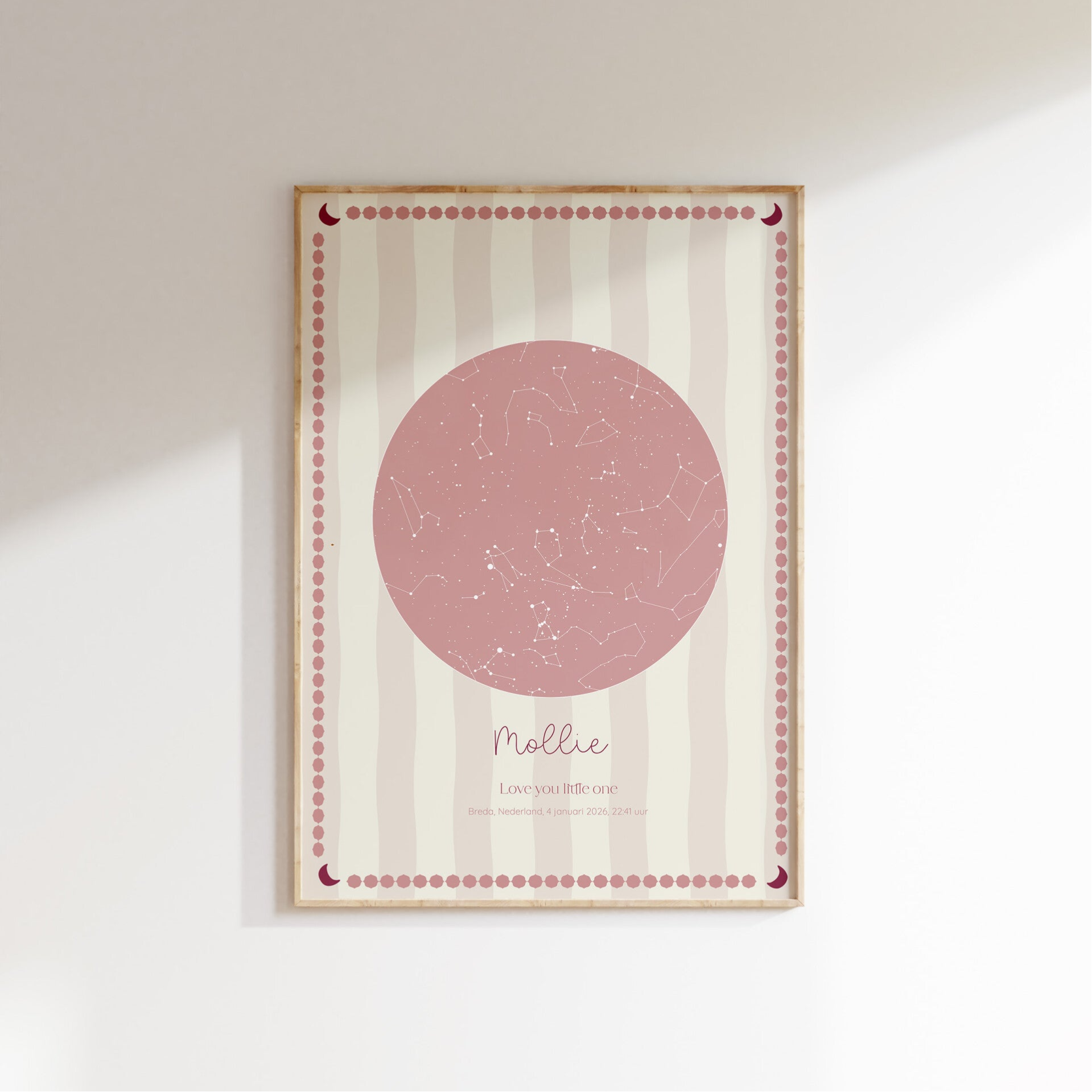 Met de naam van je kindje, de geboortedatum en -locatie wordt het een persoonlijk kunstwerkje dat perfect past in de babykamer of kinderkamer. Het rustige kleurgebruik maken de poster niet alleen mooi om naar te kijken, maar ook een fijne manier om verhalen te vertellen – over sterren, over dromen, en over hoe bijzonder die ene nacht was.