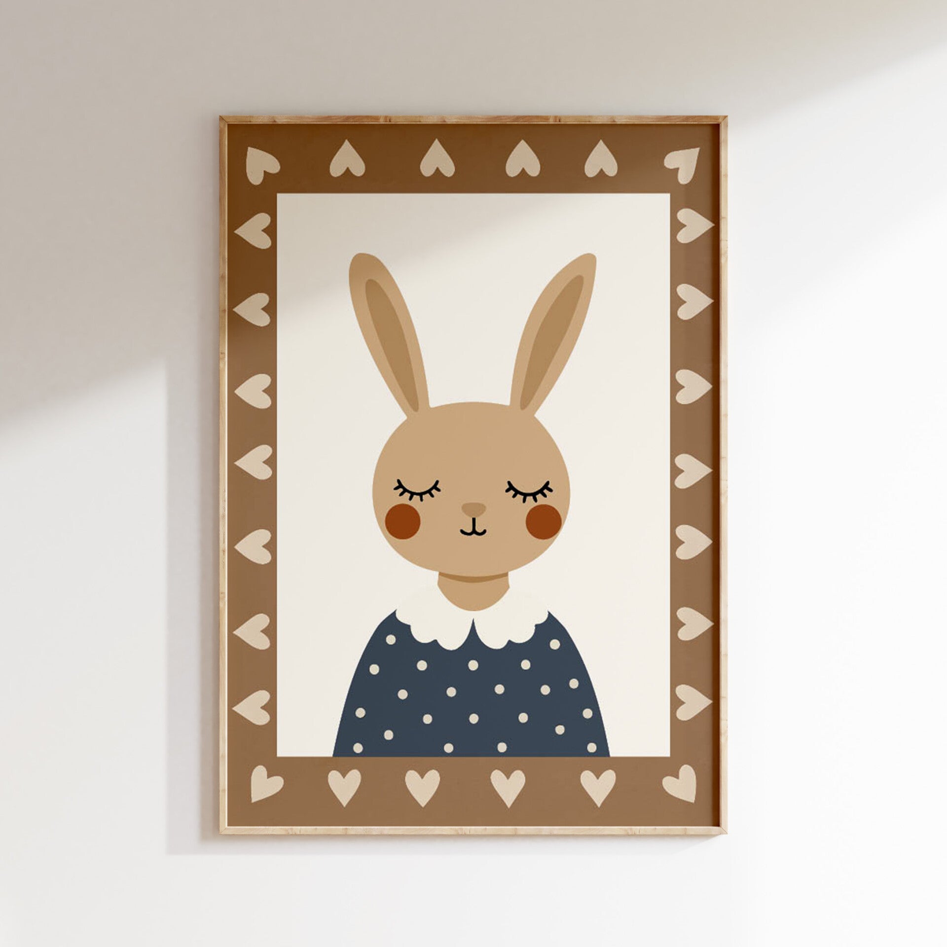 Een knusse kinderkamer print met een schattig konijntje in een warm bruin hartjeskader. De natuurlijke tinten geven een rustige uitstraling die prachtig past in zowel neutrale als aardse kinderkamerstijlen. Mooi als solo print of in combinatie met de roze variant.