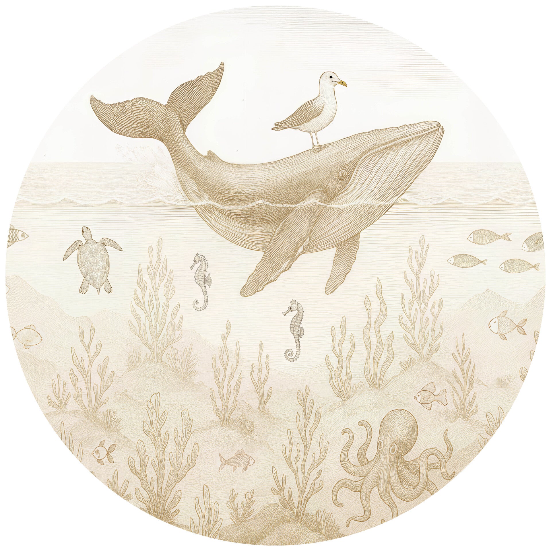 Deze sfeervolle behangcirkel brengt de rust van de oceaan naar de kinderkamer. Een vriendelijke walvis zwemt tussen vissen, zeepaardjes en ander zeeleven, terwijl boven water een vogel meereist. De zachte tinten en verfijnde illustraties zorgen voor een kalme, dromerige uitstraling die perfect past in een babykamer of rustige kinderkamer. Ideaal om een warme en fantasierijke sfeer te creëren zonder te overheersen.