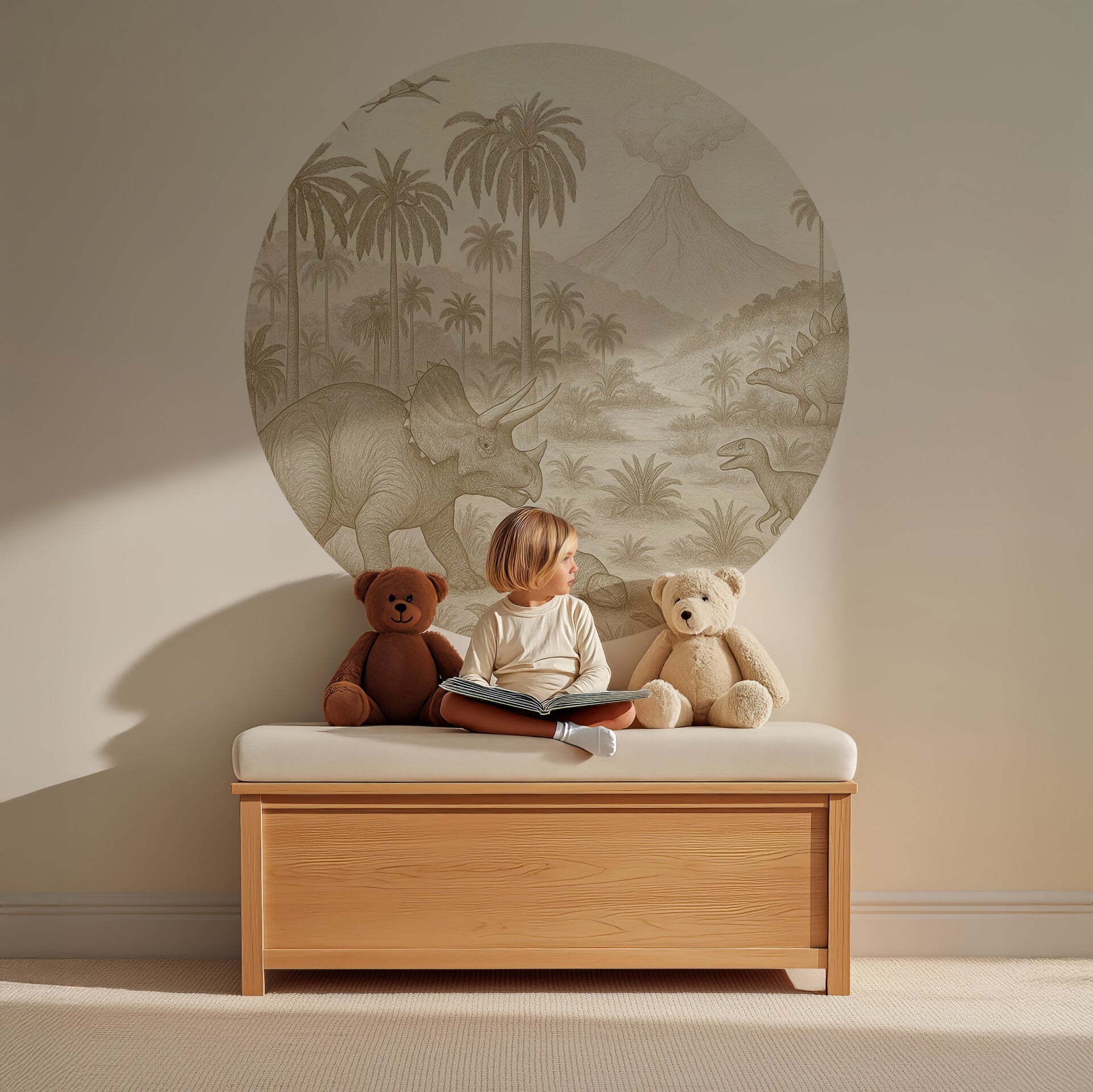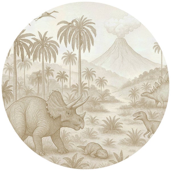 Deze indrukwekkende behangcirkel toont een krachtige triceratops met jong, omringd door andere dinosaurussen in een uitgestrekte jungle. De gedetailleerde illustraties en zachte kleurtonen zorgen voor een stoere maar warme sfeer. Perfect voor kleine dinofans die houden van avontuur, zonder dat de kamer te druk of fel wordt.