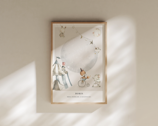 Met de naam van je kindje, de geboortedatum en -locatie wordt het een persoonlijk kunstwerkje dat perfect past in de babykamer of kinderkamer. Het rustige kleurgebruik maken de poster niet alleen mooi om naar te kijken, maar ook een fijne manier om verhalen te vertellen – over sterren, over dromen, en over hoe bijzonder die ene nacht was.
