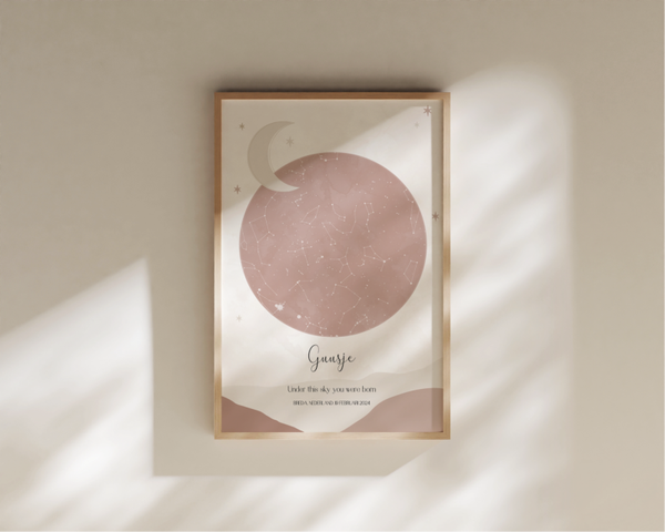 Met de naam van je kindje, de geboortedatum en -locatie wordt het een persoonlijk kunstwerkje dat perfect past in de babykamer of kinderkamer. Het rustige kleurgebruik maken de poster niet alleen mooi om naar te kijken, maar ook een fijne manier om verhalen te vertellen – over sterren, over dromen, en over hoe bijzonder die ene nacht was.
