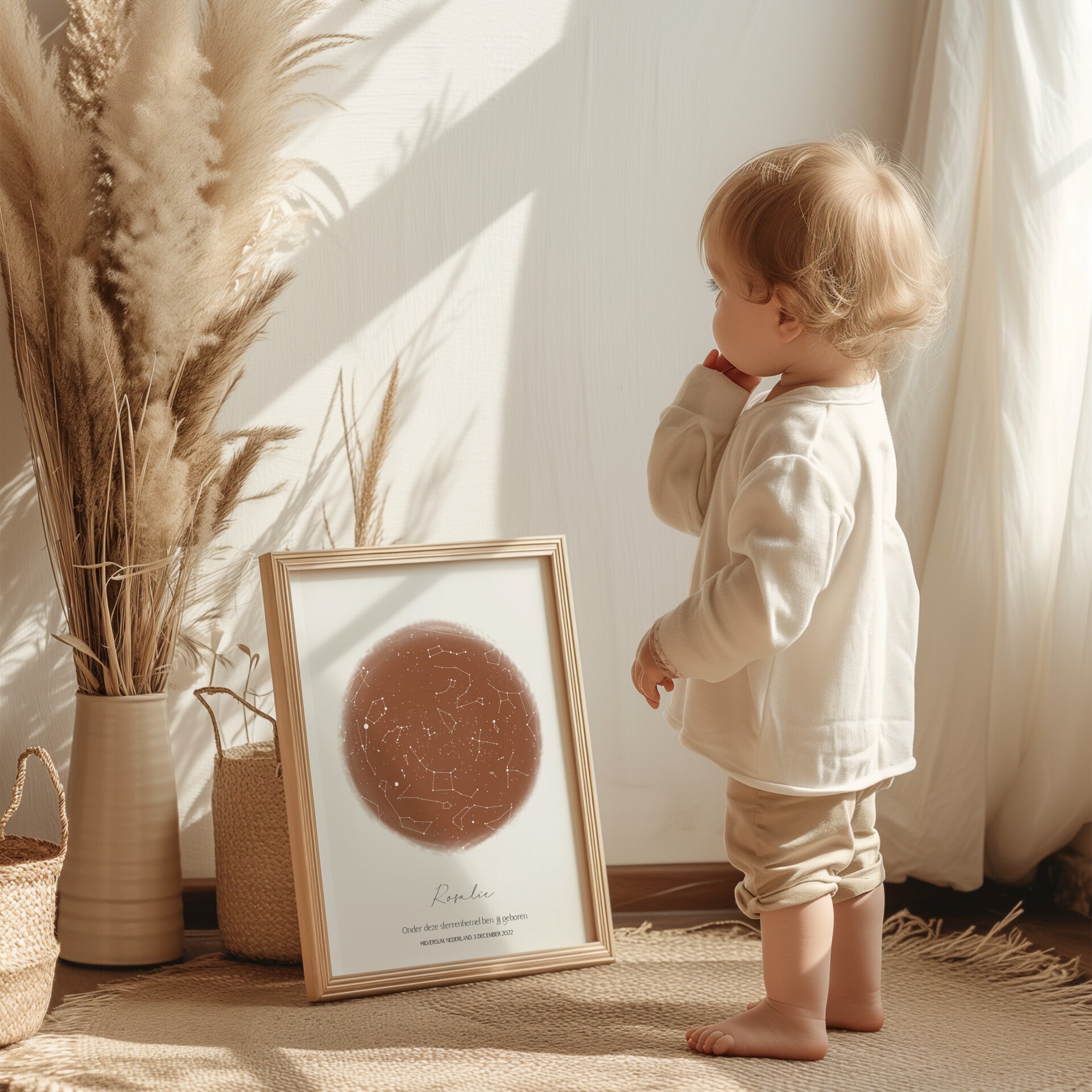 Met de naam van je kindje, de geboortedatum en -locatie wordt het een persoonlijk kunstwerkje dat perfect past in de babykamer of kinderkamer. Het rustige kleurgebruik maken de poster niet alleen mooi om naar te kijken, maar ook een fijne manier om verhalen te vertellen – over sterren, over dromen, en over hoe bijzonder die ene nacht was.